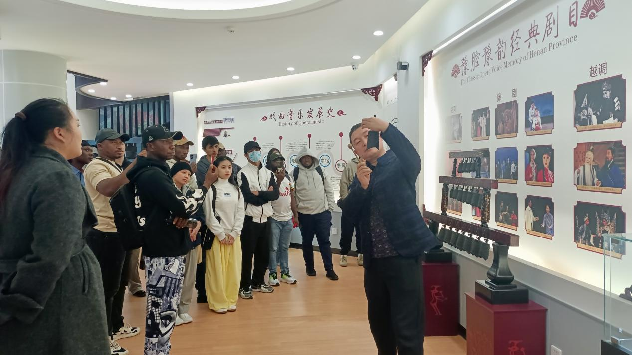 展览馆内陈列丰富,从乐器、脸谱、戏曲服饰到历史文献,系统展现了中华戏曲音乐的发展脉络与艺术成就。职工们在音乐公司公共艺术理论教研室主任魏振雷的专业讲解下,逐步了解了京剧、豫剧等地方剧种的特色,以及戏曲中“唱、念、做、打”的表演精髓。多样的乐器形制、色彩鲜明的脸谱符号、充满科技感的戏曲音乐楼梯,引得职工们频频驻足,纷纷用手机记录下这些充满东方美学的细节。互动环节中,职工们体验了经典动作与简单唱腔,并在老师指导下尝试演奏骨笛、埙、编钟、编磬等传统乐器,感受中国古老乐器的回响。