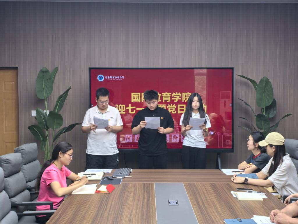 在活动中,党支部副书记郭丽和组织员樊林分别领学了习近平总书记讲话金句和评论员文章《激活高校员工社区党建“神经末梢”》。随后,党支部书记解鹏程为党员代表送上“政治生日”贺卡,樊林结合自身从教经历,畅谈对党员责任的理解;员工党员代表朗诵了诗歌《红色的七月》,通过“燎原的星火”“不灭的灯”等意象,生动诠释中国共产党百年奋斗的世界意义;通过“被你点亮的心灯,要用燃烧的生命照亮”等坚定信念,传递出新时代青年的使命担当。朗诵声情并茂,现场反响热烈。活动最后,全体党员纷纷表示将立足岗位,在促进中外文化交流中展现党员担当。