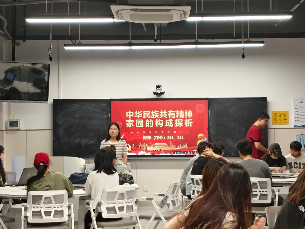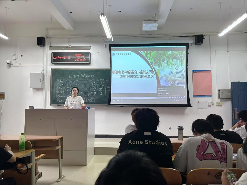 在班会上,辅导员以“中华民族一家亲,同心共筑中国梦”为主题,结合专业特色开展形式多样的教育活动。通过图文展示带领同学们回顾各民族交融发展的历史,播放的视频短片生动展现了民族团结的感人故事。辅导员还结合理论,深入剖析中华民族共同体的内涵与价值,用通俗易懂的语言讲透“平等、团结、互助、和谐”民族关系的重要意义。讨论环节,同学们踊跃发言,分享经历与见解,尽显责任担当与青春风采。班会现场气氛热烈。